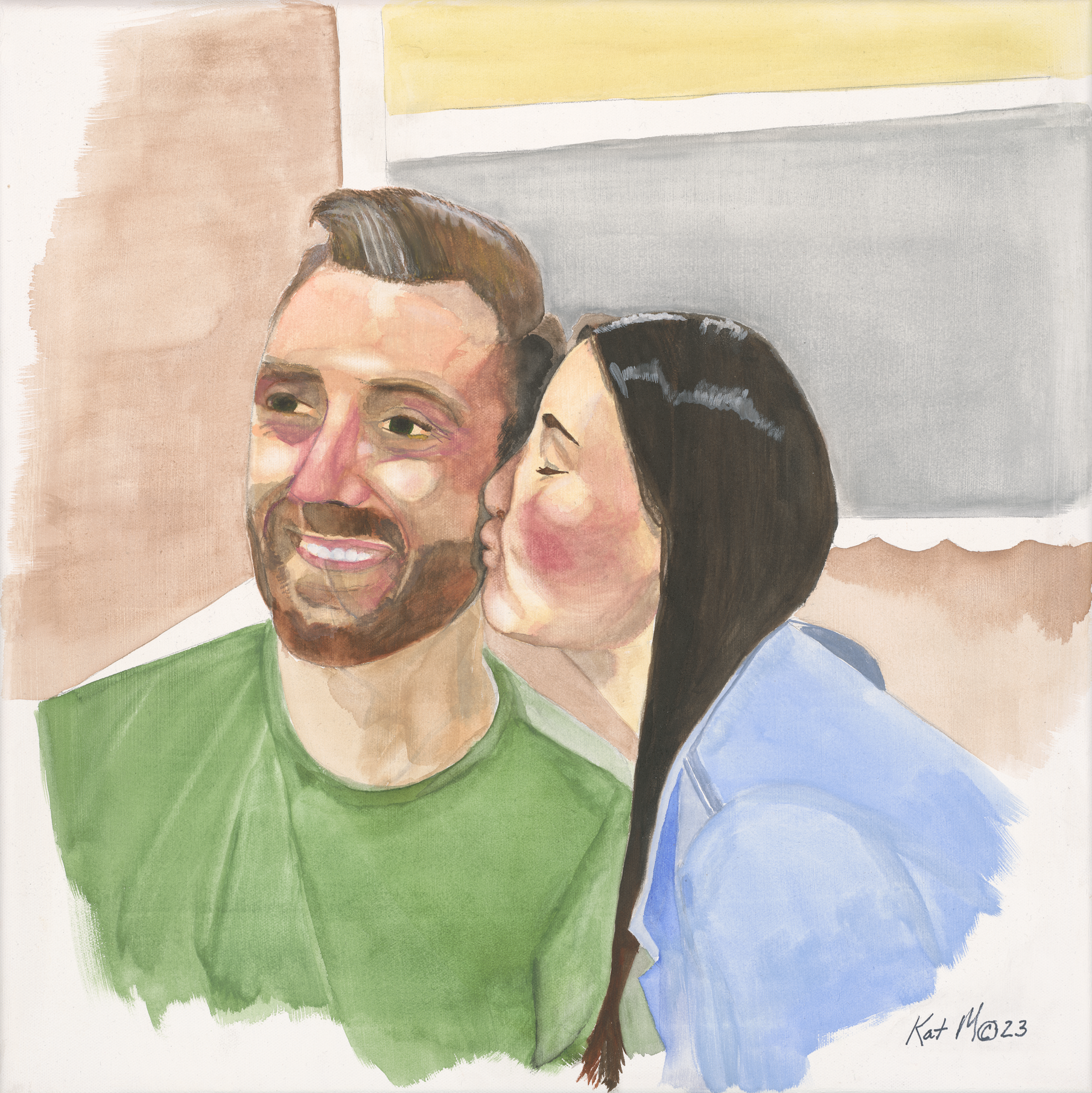 Many of my canvas watercolor florals are inspired by my daughter, Jaclyn Suchomel, a gifted floral designer and owner of The Dainty Daisy. Caught on canvas, it is a beautiful moment of joy: her kissing her fiancé, Scott, at the Old Bully Tavern in Beaufort, S.C.